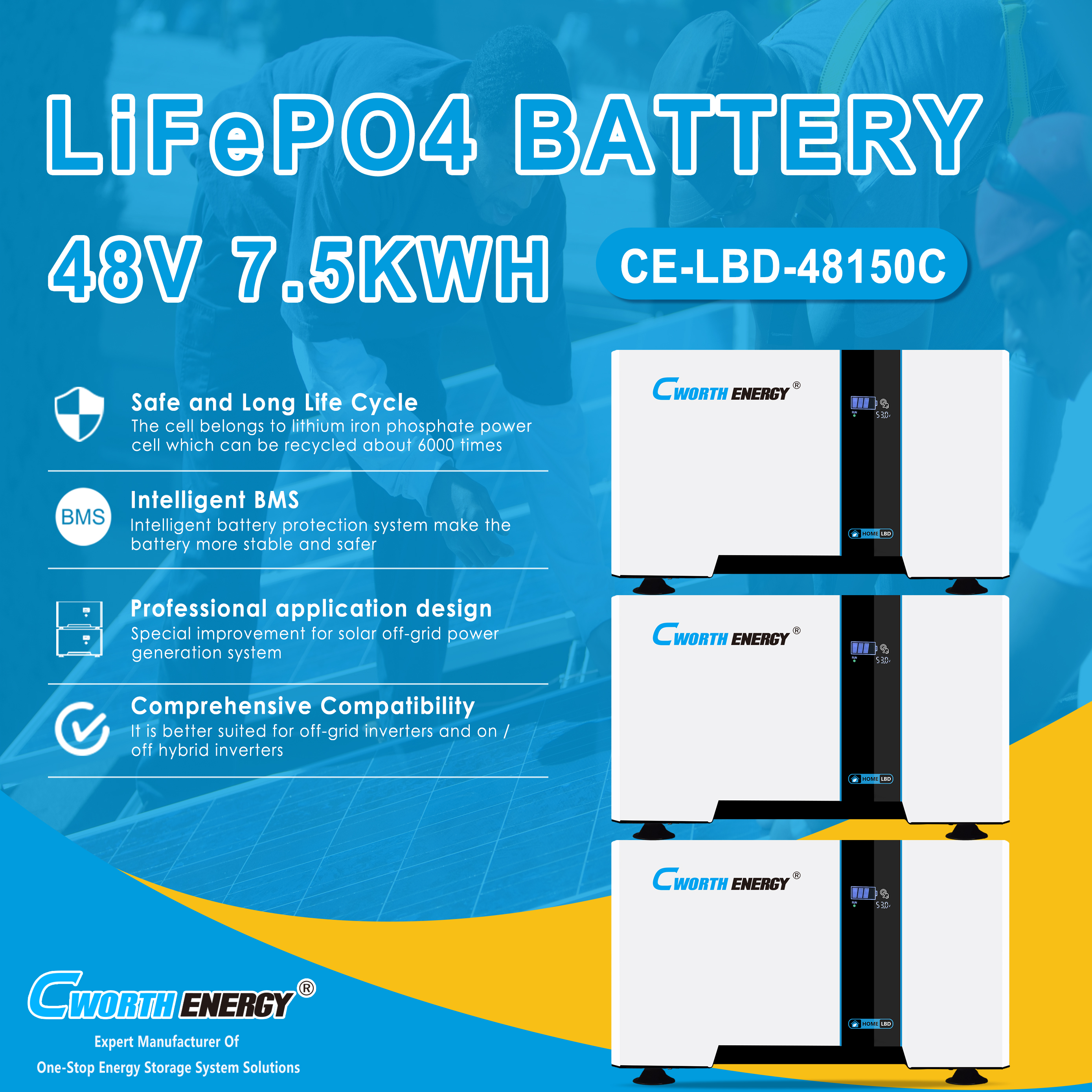 Specifications: • Model: CE-LBD-48150C • Capacity: 7.5KWH • Voltage: 48V • Normal voltage: 51.2V • Normal voltage range: 48-57.6V • Charge cut-off voltage: 57.6V • Discharge cut-off voltage: 48V • Max. Charge & discharge current: 150A • Recommend Charge & discharge current: ≤100A • Normal output power: 5120W • Max. Output power: 7680W • Parallel connection amount: 1-6 • Ingress protection: IP21 • Cycle times: ≥6000@80% DOD, 25°C, 0.5C • Working temperature: -10~60℃ • Net weight: 83.5kg • Product dimension: 680*450*420mm • Model: CE-LBD-48150C • Capacity: 7.5KWH • Voltage: 48V • Normal voltage: 51.2V • Normal voltage range: 48-57.6V • Charge cut-off voltage: 57.6V • Discharge cut-off voltage: 48V • Max. Charge & discharge current: 150A • Recommend Charge & discharge current: ≤100A • Normal output power: 5120W • Max. Output power: 7680W • Parallel connection amount: 1-6 • Ingress protection: IP21 • Cycle times: ≥6000@80% DOD, 25°C, 0.5C • Working temperature: -10~60℃ • Net weight: 83.5kg • Product dimension: 680*450*420mm