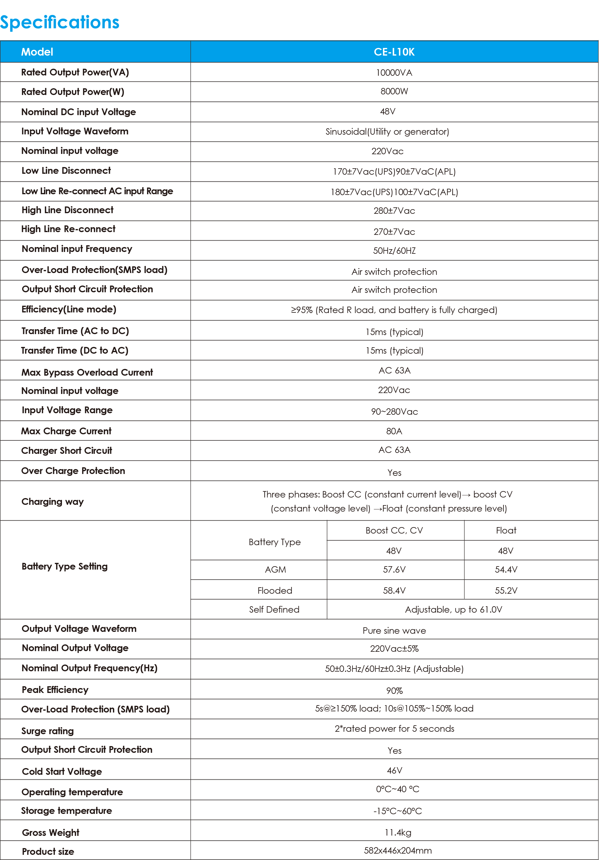 Le CE-L10K est un onduleur solaire haute performance conçu pour la conversion d’énergie dans les systèmes solaires résidentiels et les petites installations commerciales. Il fournit une puissance nominale de 10 000VA (8 000W) avec une sortie sinusoïdale pure garantissant une alimentation stable et efficace. L’onduleur fonctionne avec des batteries 48V et intègre plusieurs protections avancées, une gestion intelligente de la charge et un temps de transfert rapide afin d’assurer une alimentation continue des équipements connectés. Avantages : • Sortie sinusoïdale pure pour une alimentation stable et fiable. • Compatible avec le réseau électrique ou un générateur. • Protection avancée contre les surcharges, les courts-circuits et les surcharges de batterie. • Rendement élevé jusqu’à 95 % en mode ligne. • Temps de transfert rapide de 15 ms pour une commutation sans interruption. • Système intelligent de charge de batterie en trois étapes. • Large plage de tension d’entrée AC pour une installation flexible. • Compatible avec batteries AGM, plomb ouvert et configurations personnalisées. Spécifications : • Modèle : CE-L10K • Puissance nominale : 10000VA / 8000W • Tension d’entrée DC nominale : 48V • Tension d’entrée nominale : 220Vac • Plage de tension d’entrée : 90–280Vac • Fréquence d’entrée : 50Hz / 60Hz • Forme d’onde de sortie : Sinusoïde pure • Tension de sortie nominale : 220Vac ±5% • Fréquence de sortie : 50Hz / 60Hz (réglable) • Courant de charge maximal : 80A • Rendement maximal : 90% • Rendement (mode ligne) : ≥95% • Temps de transfert : 15 ms (typique) • Puissance de crête : 2 × puissance nominale pendant 5 secondes • Température de fonctionnement : 0°C – 40°C • Température de stockage : -15°C – 60°C • Poids brut : 11.4 kg • Dimensions : 582 × 446 × 204 mm