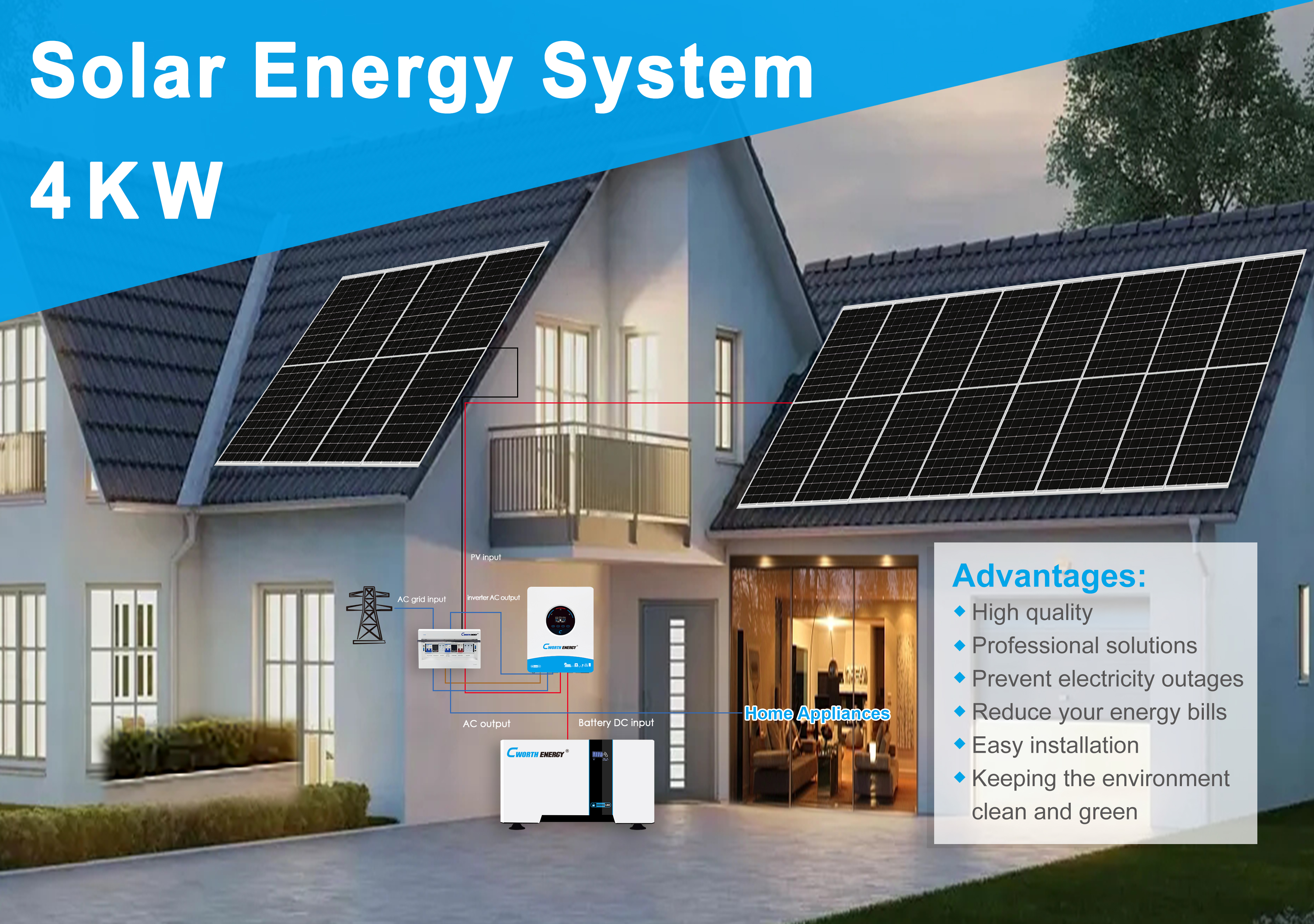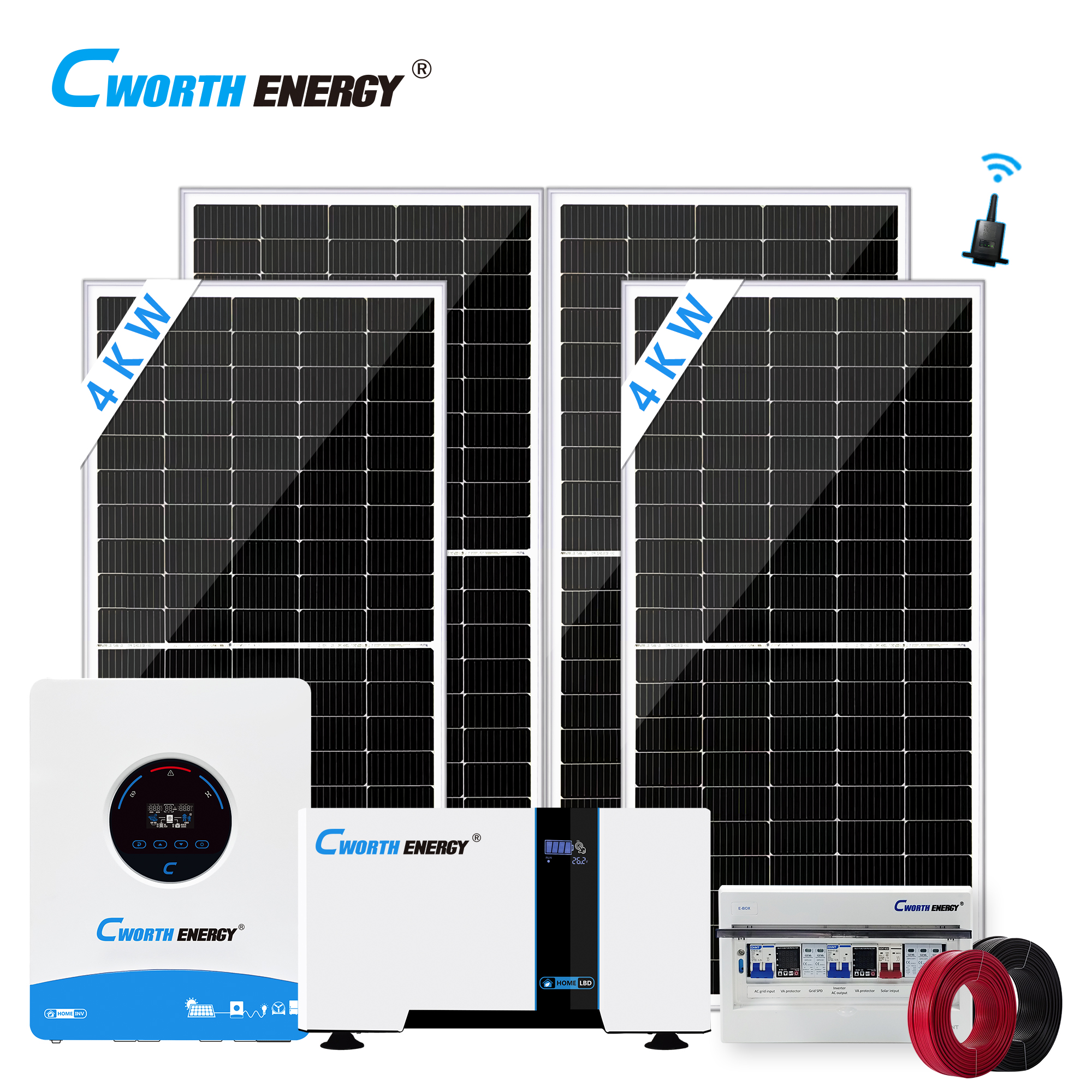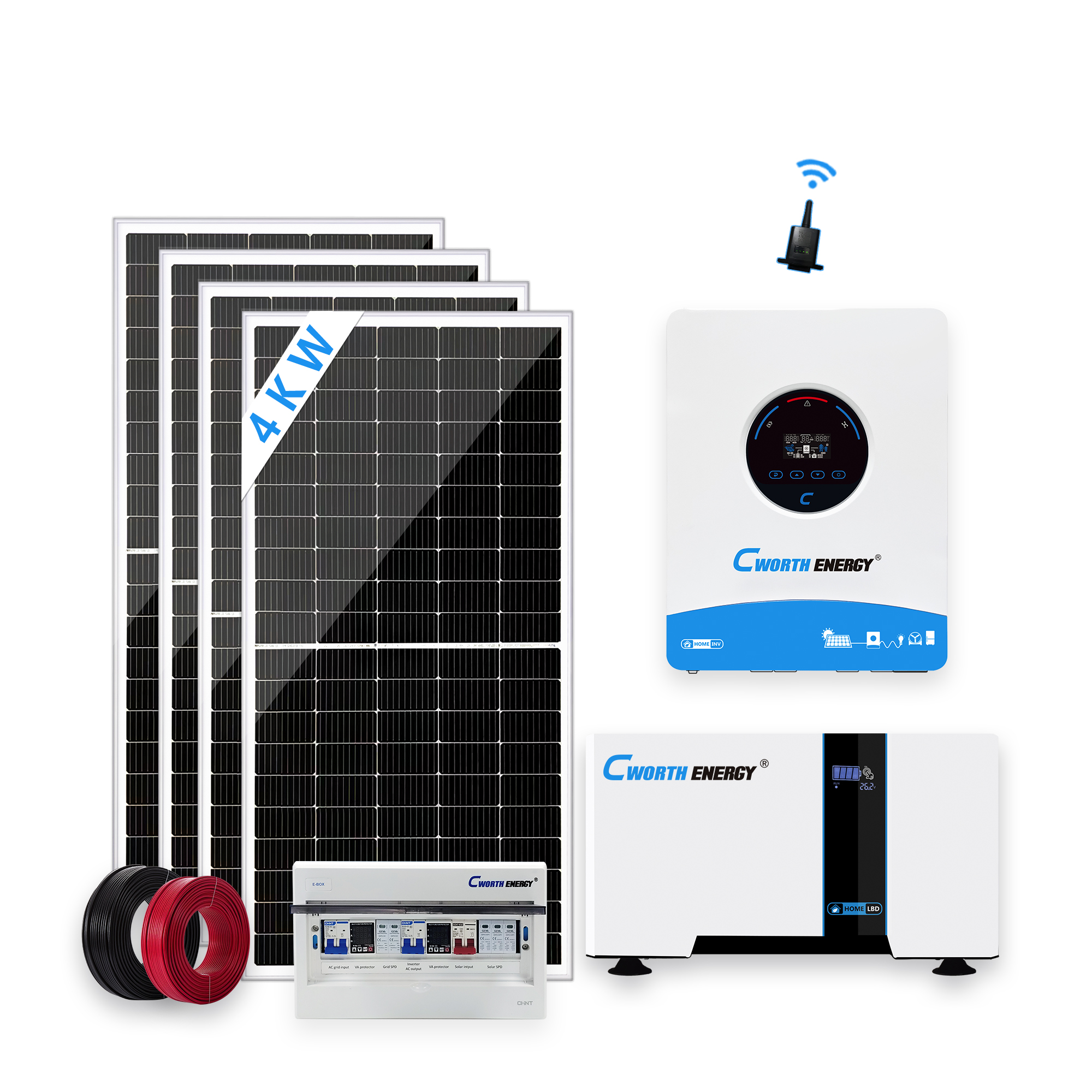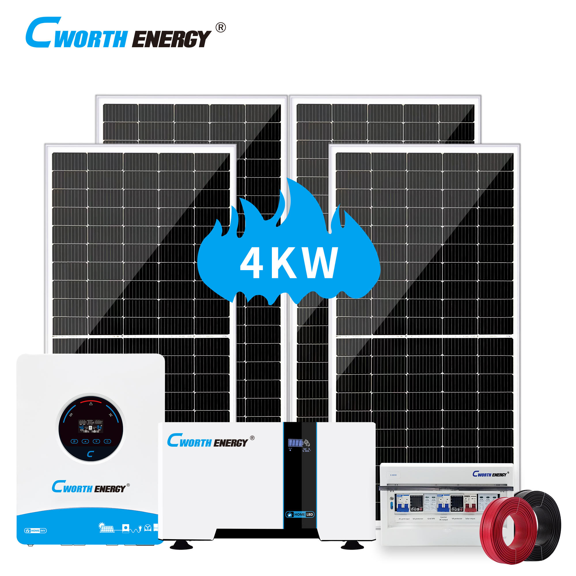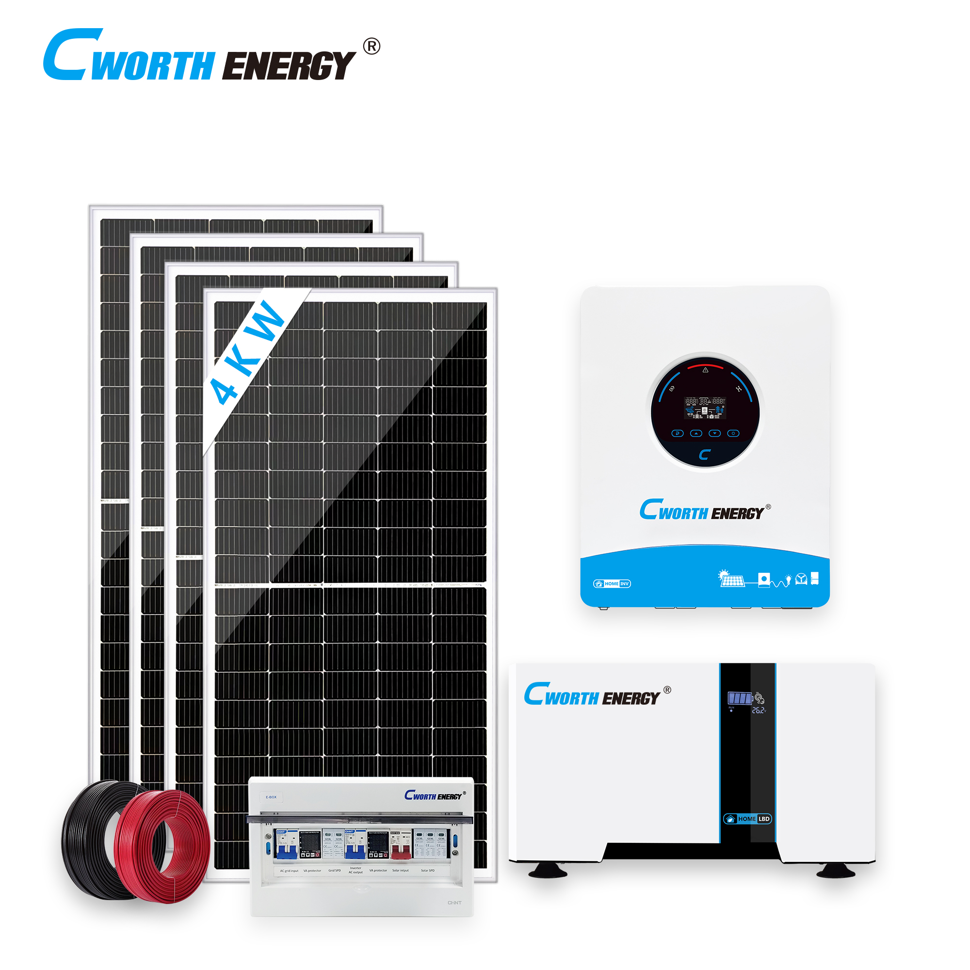 Spécifications : • Modèle : 4 KW • onduleur : 4KW DC 24VAC 230V 50Hz/60HzMPPT 120A * 1 unité • panneau solaire : 4 pièces * 400 W 34,8 V • Batterie au lithium : CE-LBD-24200C 5KWH* 1 unité • E-BOX : 1 pièce • Cadre PV : 1* ensemble • Câble PV : rouge 4 mm² * 20 m • Modèle : 4 KW • onduleur : 4KW DC 24VAC 230V 50Hz/60HzMPPT 120A * 1 unité • panneau solaire : 4 pièces * 400 W 34,8 V • Batterie au lithium : CE-LBD-24200C 5KWH* 1 unité • E-BOX : 1 pièce • Cadre PV : 1* ensemble • Câble PV : rouge 4 mm² * 20 m